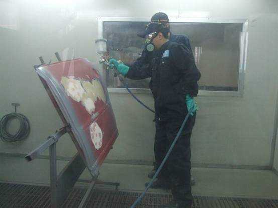 老師們在烤漆房內實操噴槍對鈑件進行底漆噴涂作業,宋老師耐心指導