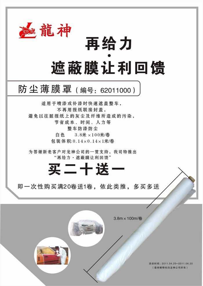 2011年4月再給力·遮蔽膜讓利回饋促銷! 2011年4月再給力·遮蔽膜讓利回饋促銷! (活動(dòng)已結(jié)束,感謝您的關(guān)注) 一、活動(dòng)主題: “再給力,遮蔽膜讓利回饋” 二、活動(dòng)時(shí)間: 1、時(shí)間:2011年04月20日至2011年06月20日 2、時(shí)長(zhǎng):共計(jì)2個(gè)月 三、促銷產(chǎn)品: 防塵薄膜罩 尺寸3.8米*100米/卷 龍神編號(hào):62011000 買20送1 ,一次性購買滿20卷送1卷,如此類推,多買多送。 2011-04-19 12453