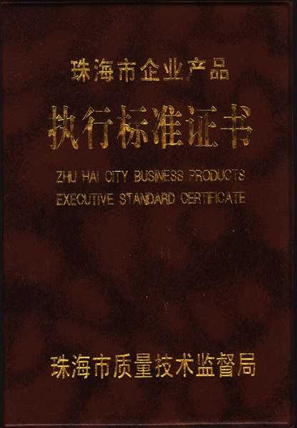 珠海市企業產品執行標準證書