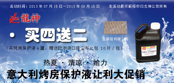 "熱夏 清涼 給力" 意大利烤房保護液讓利大促銷! 2013-07-16 25477 "熱夏 清涼 給力" 意大利烤房保護液讓利大促銷!活動時間:2013年07月15日至2013年09月15日。 時長:共計2個月