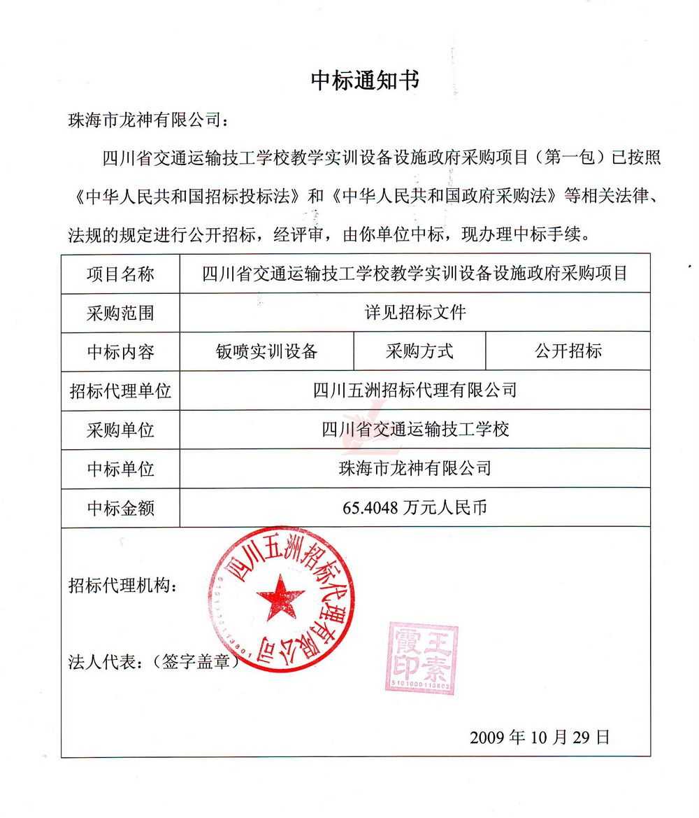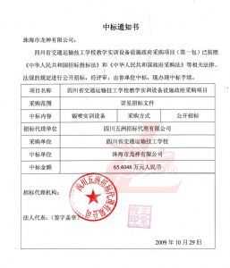 [喜訊]熱烈祝賀龍神成功中標-四川省交通運輸技工學校 [喜訊]熱烈祝賀龍神成功中得四川省交通運輸技工學校標 [新聞中心]珠海市龍神有限公司經過長時間的籌備已成功中得四川省交通運輸技工學校教學實訓設備設施政府采購項目標,這是珠海市龍神有限公司一種實力的表現。說明了珠海龍神的品牌在不斷的加強、深化。 珠海龍神公司一直專業、效率、服務、環保。同時“龍神”在創新中求發展,在發展中求創新的原則。 (中標通知書,點擊放大圖) 2009-11-06 9232